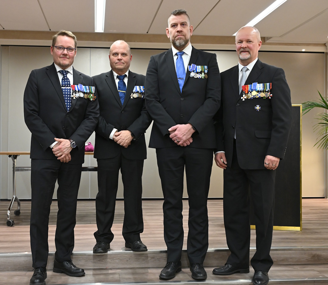 Uudet puheenjohtajat Juha Vimpari ja Aki Imppola keskellä, väistyvät puheenjohtajat Perttu Hietanen vasemmalla ja Mika Pakkanen oikealla.