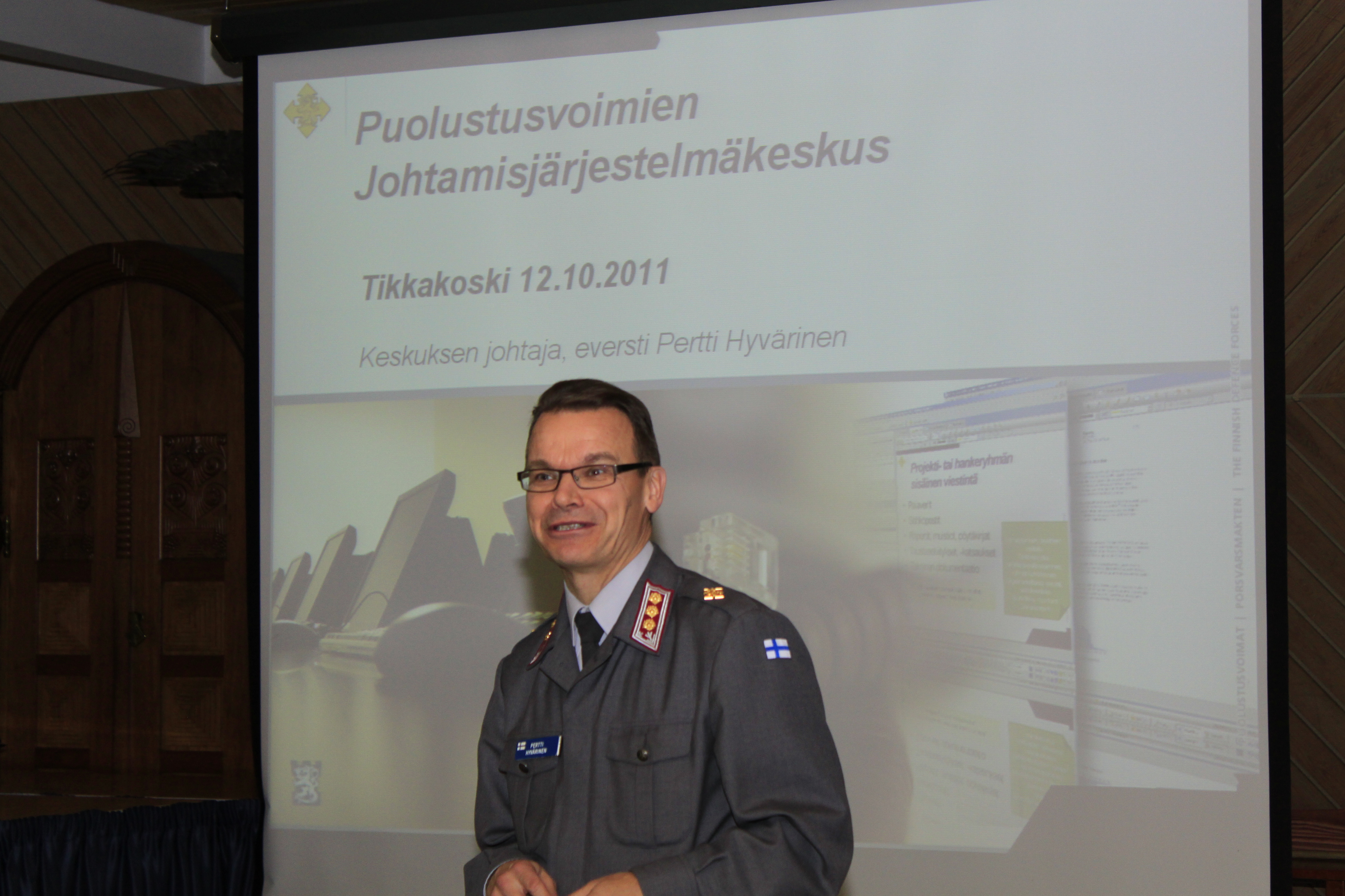 Keski-Suomen Reserviläispiirin puheenjohtaja Keijo Häkkinen toivotti kokousväen tervetulleiksi piirien kokouksiin. Tänä vuonna oli kokousesitelmöijänä Puolustusvoimien Johtamisjärjestelmäkeskuksen päällikkö eversti Pertti Hyvärinen. Hän valotti kuulijoille puolustusvoimien suurimman joukko-osaston PVJJK:n organisaatiota ja tehtäviä sekä sivusi johtamaansa joukko-osastoon liittyviä puolustusvoimissa käynnissä olevia muutospaineita. Kuulijat kokivat nuoren joukko-osaston esittelyn mielenkiintoiseksi ja valaisevaksi.