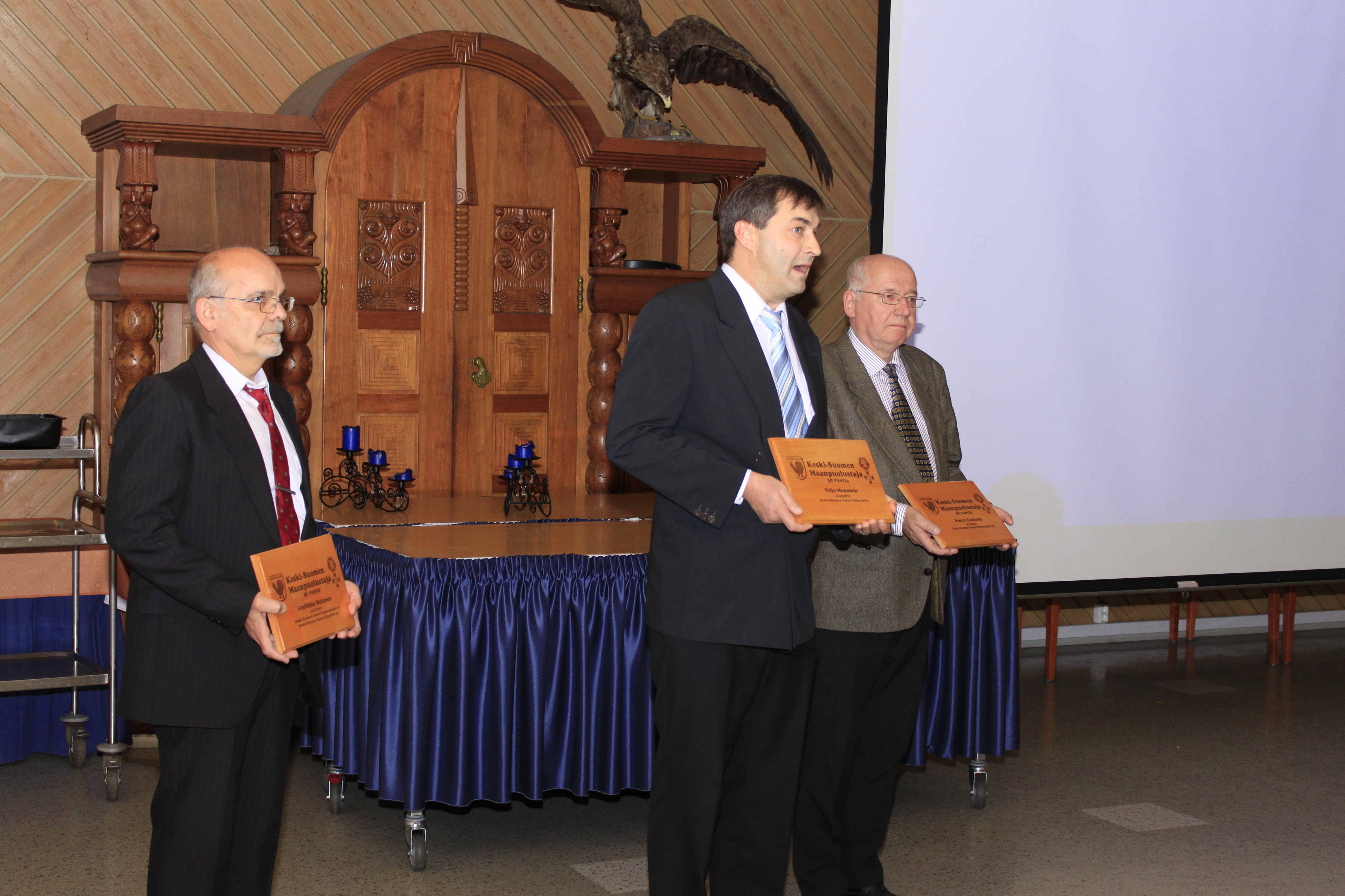 Illan palkitsemisosassa reservipiirit muistivat piirilehtemme Keski-Suomen Maanpuolustaja lehden päätoimittajaa Pentti Ruohotietä (oik.), taittajaa Antero Rutasta (vas.) ja ilmoitusmyyjää Veijo Monosta uniikilla plaketilla.