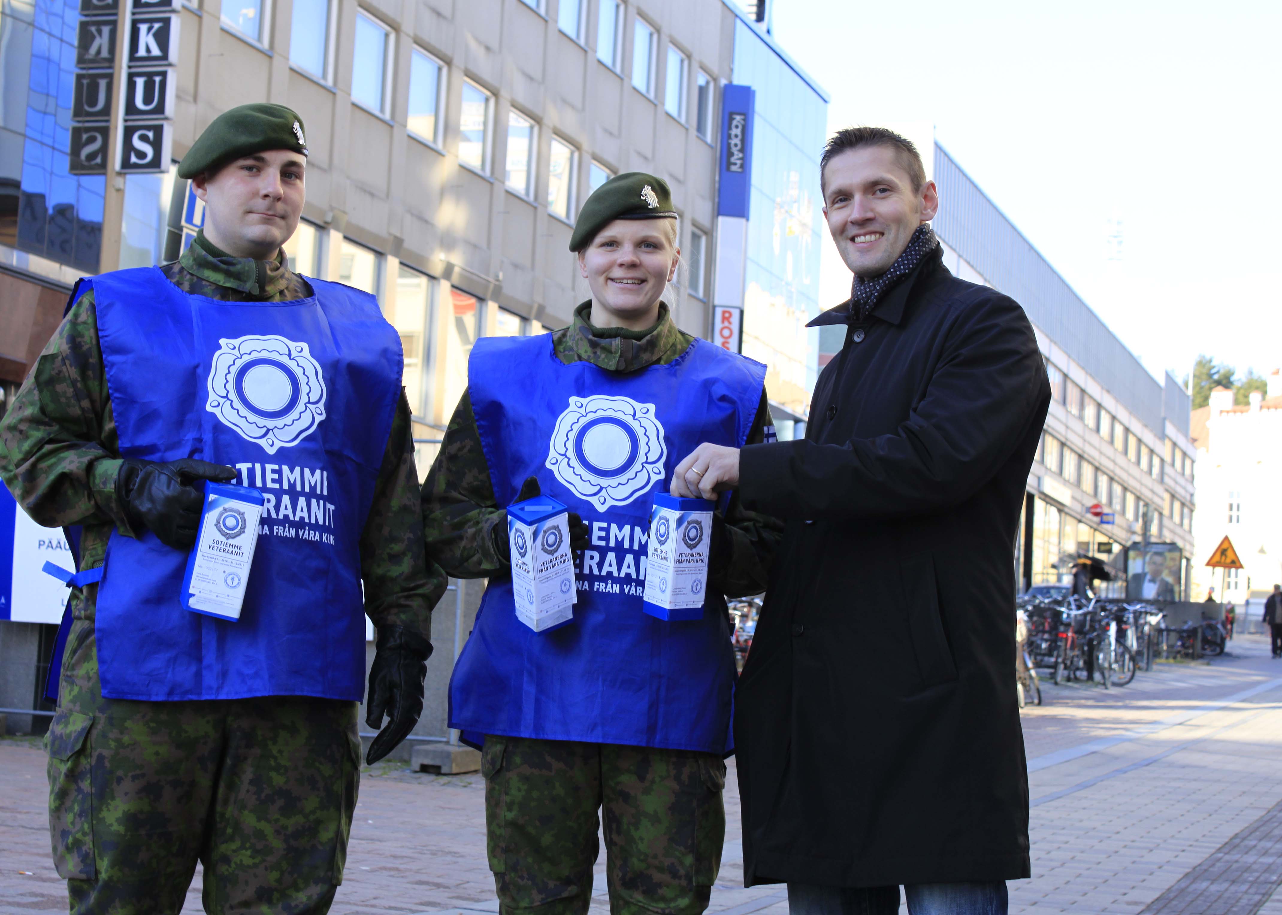 arvostusta veteraaneja kohtaan. Hän näki veteraanitukiasian siinä valossa että valtiovallan olisi pitänyt hoitaa veteraanien tukeminen lopullisesti järjestykseen jo vuosikymmeniä aikaisemmin. Puolustusvoimien tulevista muutospaineista Wallinheimo sanoi Keski-Suomen kansanedustajien pitävän puolueisiin katsomatta maakuntamme varuskuntien puolta tehtäessä säästö- tai lopettamisista poliittisia päätöksiä. Pioneerirykmentin suojelukomppanian alikersantit Virtanen (vas) ja Ollikainen ojentavat keräyslippaita Wallinheimolle.