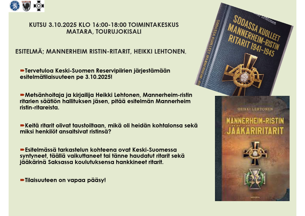 Metsänhoitaja ja tietokirjailija Heikki Lehtonen, Mannerheim-ristin ritarien säätiön hallituksen jäsen, pitää esitelmän Mannerheim-ristin ritareista perjantaina 3.10.2025 klo 16:00–18:00 Toimintakeskus Matarassa Jyväskylässä.